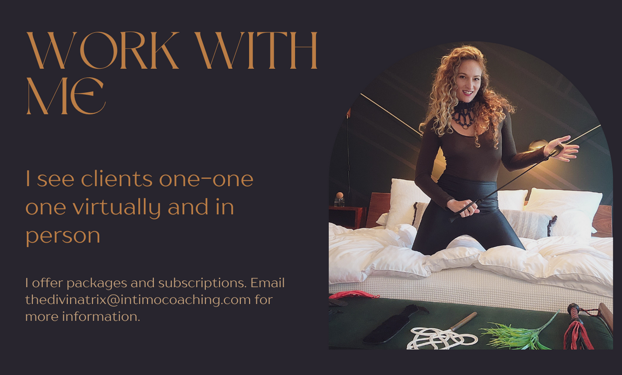 I help busy professionals like you unlock their unique erotic style and learn the keys to deep, fulfilling intimacy. As a coach, teacher, and muse, I specialize in conscious kink and BDSM, Tantra and Sacred Sexuality, ethical nonmonogamy, relationship design, conscious communication and embodiment, and erotic mastery.
